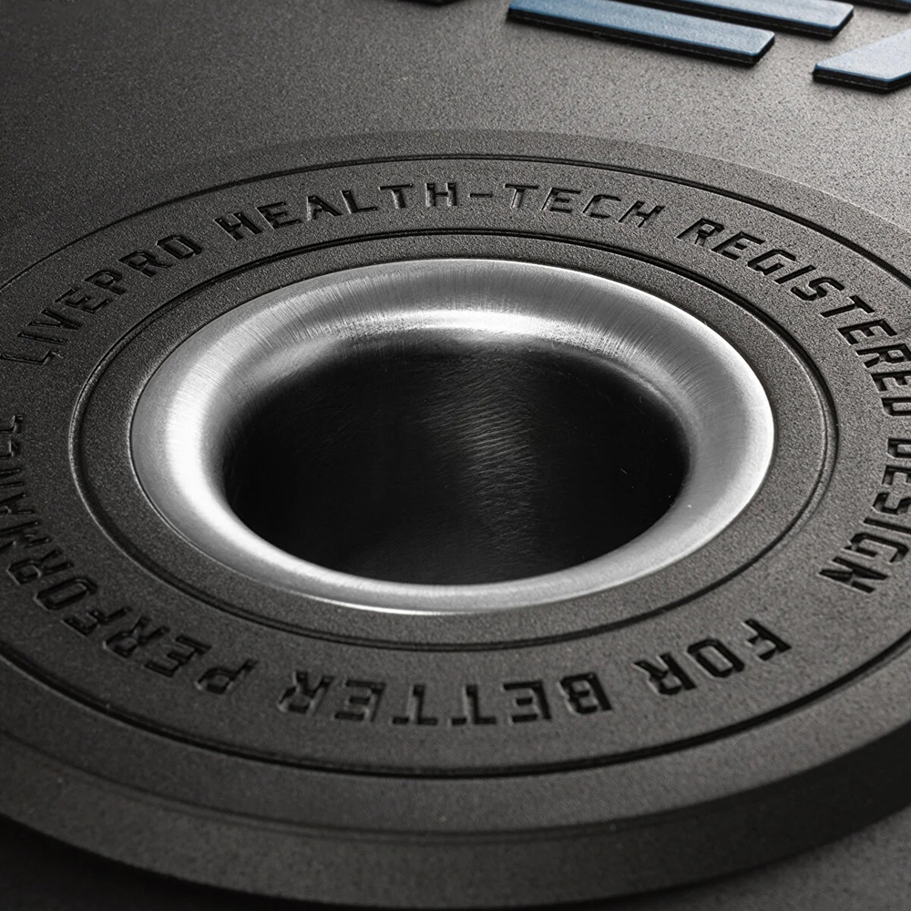 Οι έγχρωμοι δίσκοι προπόνησης από καουτσούκ της Livepro διαμορφώνονται σε υψηλές θερμοκρασίες με νέο τύπου λάστιχου πάχους 24-88mm. Είναι αθόρυβοι και δεν φθείρουν το πάτωμα. Αυτοί οι δίσκοι είναι εξαιρετικά αδιάβροχοι και ανθεκτικοί στη φθορά. Ο εσωτερικός δακτύλιος από ανοξείδωτο χάλυβα είναι εύκολος να τοποθετηθεί και να αφαιρεθεί από μια μπάρα. Πέρασε επιτυχώς χωρίς ζημιές μια αυστηρή δοκιμή πτώσης.Διακρίνονται εύκολα, από την έγχρωμη κωδικοποιημένη εκτύπωση βάρους.