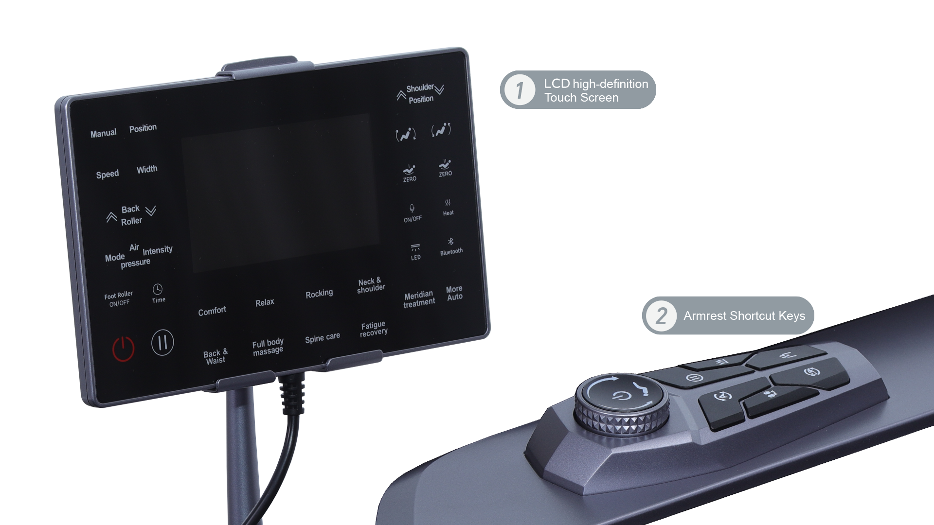 Δύο μέθοδοι λειτουργίας έχουν αναβαθμιστεί σε αυτήν την πολυθρόνα μασάζ. Η μεγάλη οθόνη LCD παρουσιάζει τις κύριες λειτουργίες πιο καθαρά από ένα χειριστήριο χειρός. Είναι λεπτομερής, προσφέρει πολλές πληροφορίες, περιστρέφεται εύκολα, έχει ευκρινή απεικόνιση και επιτρέπει γρήγορο και αποτελεσματικό χειρισμό. Τα πλήκτρα συντόμευσης του υποβραχιόνιου έχουν ρυθμιστεί για τις λειτουργίες που χρησιμοποιείτε συχνά ώστε να μπορείτε να κάνετε ομαλή εναλλαγή μεταξύ των λειτουργιών μασάζ.