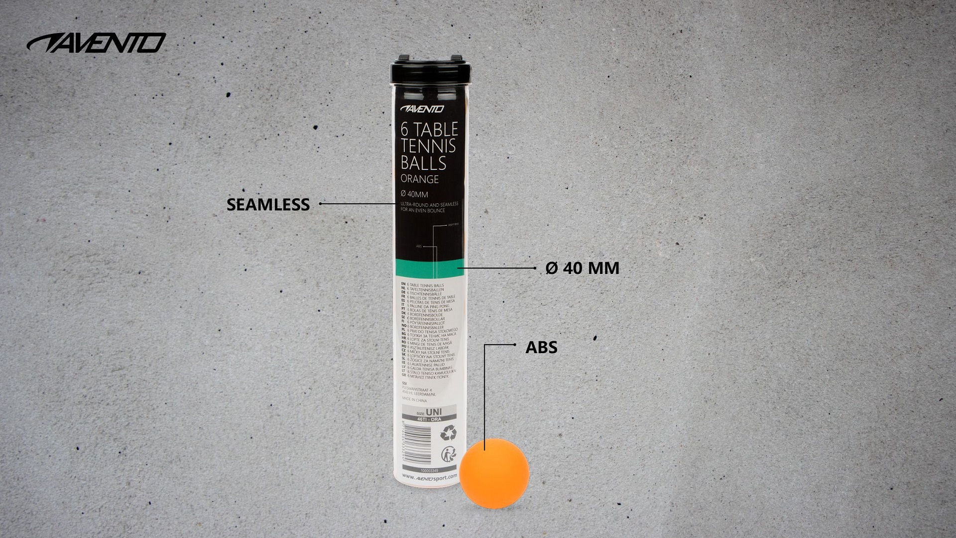 Πορτοκαλί μπαλάκια Ping Pong διαμέτρου 40mm από την Ολλανδική Avento σε βολική συσκευασία 6 τεμαχίων, κατασκευασμένα από υλικό ABS για καλύτερη αναπήδηση.