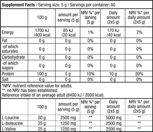 Ενημέρωσέ με όταν ξανάρθειΤο 100% BCAA είναι ένα αμινοξύ με καθαρότητα 100% . Τα αμινοξέα είναι τα δομικά στοιχεία των πρωτεϊνών που συμβάλλουν στην ανάπτυξη της μυϊκής μάζας και τη συντήρησή της. Το προϊόν σε μορφή σκόνης περιέχει τρία βασικά αμινοξέα.Ισολευκίνη, λευκίνη και βαλίνη,σε αναλογία 2:1:1. Λόγω της χημικής τους δομής, εκπροσωπούν συλλογικά όλη την ομάδα των αμινοξέων διακλαδιζόμενης αλυσίδας (BCAA).