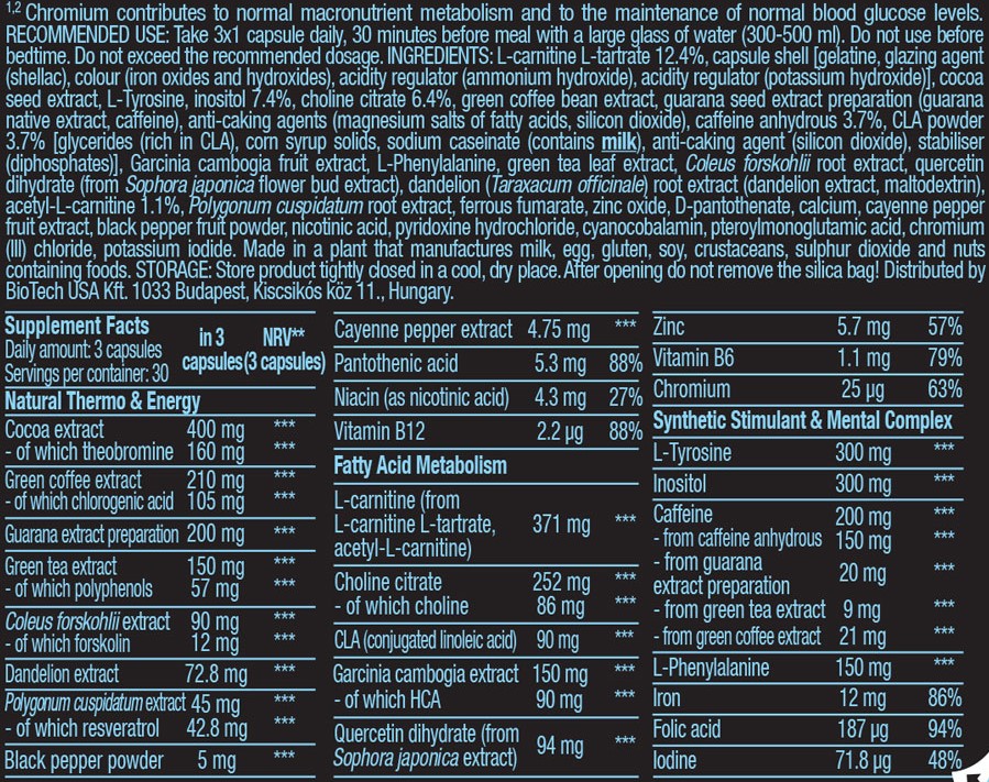 BioTech USA Black Burn 90 Mega CapsΔιαμορφώνετε το σώμα σας με βάση ένα προπονητικό πλάνο, προσαρμόζοντας τη διατροφή σας για να ασκείστε και χρησιμοποιώντας συμπληρώματα διατροφής αλλά το αποτέλεσμα δεν είναι ακόμα τέλειο; Επιλέξτε το Black Burn και πετύχετε τους στόχους σας!28 δραστικά συστατικάΚάθε μερίδα περιέχει 200 mg καφεΐνηςΜε 11 είδη φυτικών εκχυλισμάτωνσυμπεριλαμβανομένης της σκόνης μαύρου πιπεριού και του εκχυλίσματος πιπεριού καγιένΜε 2 πηγές L-καρνιτίνης: L-καρνιτίνη, L-τρυγική και ακετυλική-L-καρνιτίνηΜε χολίνη, το HCA (από εκχύλισμα φρούτων Garcinia cambogia) και το CLA (συζευγμένο λινολεϊκό οξύ) Με2 τύπους αμινοξέων: με L-τυροσίνη και L-φαινυλαλανίνηΜε 4 μικροθρεπτικά συστατικά: σίδηρος, ιώδιο, ψευδάργυρος, χρώμιοΜε 5 τύπους βιταμινών: σύμπλεγμα βιταμίνης Β (βιταμίνες Β3, Β5, Β6, Β9 και Β12)BLACK BURN - EXTREME. Η ΣΥΝΘΕΣΗ ΠΟΥ ΠΕΡΙΛΑΜΒΑΝΕΙ ΤΑ ΠΑΝΤΑ! 1. Κάνετε το καλύτερό σας για τον βέλτιστο μεταβολισμό των λιπών → Μεταξύ των ενεργών συστατικών του Black Burn, ο ψευδάργυρος συμβάλλει στον φυσιολογικό μεταβολισμό των λιπαρών οξέων. Ενώ η χολίνη εμπλέκεται στον φυσιολογικό μεταβολισμό του λίπους. 2. Ενεργοποιήστε τον εαυτό σας → Μεταξύ των βιταμινών που περιέχονται στο προϊόν, η νιασίνη, το παντοθενικό οξύ και η βιταμίνη Β12 εμπλέκονται στον φυσιολογικό μεταβολισμό παραγωγής ενέργειας και συμβάλλουν στη μείωση της κόπωσης και της εξάντλησης. 3. Η τόνωση σε όλα τα επίπεδα → Η περιεκτικότητα σιδήρου και ιωδίου του Black Burn συμβάλλει στη διατήρηση της κανονικής ψυχικής λειτουργίας. Επιπλέον, το ιώδιο συμβάλλει στην κανονική λειτουργία του νευρικού συστήματος. Το φυλλικό οξύ (βιταμίνη Β9) συμβάλλει στη διατήρηση της φυσιολογικής ψυχολογικής λειτουργίας. 4. Ελέγξτε την όρεξη σας! → Η περιεκτικότητα σε χρώμιο του προϊόντος συμβάλλει στη διατήρηση των φυσιολογικών επιπέδων γλυκόζης στο αίμα. Τι περιέχει το Black Burn;Εκτός από τα βασικά συμπλέγματα βιταμινών και ανόργανων συστατικών του Black Burn, υπάρχουν δημοφιλή συστατικά όπως η L-καρνιτίνη, η L-τυροσίνη, το CLA, το HCA η ινοσιτόλη. Μεταξύ των διαφοροποιημένων δραστικών συστατικών του προϊόντος, υπάρχουν 11 φυτικά εκχυλίσματα όπως πιπέρι καγιέν, μαύρο πιπέρι, ρίζα Coleus forskohlii, φύλλα πράσινου τσαγιού, πράσινος καφές και γκουαράνα. Τα τελευταία 3 φυτικά εκχυλίσματα χρησιμεύουν επίσης ως φυσική πηγή καφεΐνης, αλλά την εμπλουτίσαμε και με την προσθήκη άνυδρης καφεΐνης, για ακόμα μεγαλύτερη ενεργοποίηση!Μία μερίδα (3 κάψουλες) περιέχει:371 mg L-καρνιτίνης (από L-καρνιτίνη, L-τρυγική και ακετυλο-L-καρνιτίνη)252 mg κιτρικού χολίνης90 mg CLA90 mg HCA94 mg διένυδρης τετρακετίνης5,7 mg ψευδαργύρου25 μg χρωμίου1,1 mg βιταμίνης Β6400 mg εκχύλισμα σπόρου κακάουαπό τα οποία η θεοβρωμίνη 160 mg210 mg πράσινου εκχυλίσματος κόκκου καφέαπό τα οποία 105 mg χλωρογενικού οξέος150 mg εκχύλισμα φύλλων πράσινου τσαγιούαπό τα οποία οι πολυφαινόλες 57 mg200 mg παρασκευάσματος εκχυλίσματος σπόρου γκουαράνας90 mg εκχύλισμα ρίζας Coleus forskohliiαπό τα οποία η φορσκολίνη 12 mg5 mg σκόνη μαύρου πιπεριού4,75 mg εκχύλισμα πιπεριού καγιέν72,8 mg εκχυλίσματος ρίζας από πικραλίδα45 mg εκχυλίσματος ρίζας Polygonum cuspidatumαπό τα οποία η ρεσβερατρόλη 42,8 mg5.3 mg παντοθενικού οξέος4.3 mg νιασίνης2,2 μg βιταμίνης Β12200 mg καφεΐνης300 mg ινοσιτόλης300 mg L-τυροσίνης150 mg L-φαινυλαλανίνης12 mg σιδήρου187 μg φολικού οξέος71,8 μg ιωδίουΔοσολογία: Πάρτε 3 κάψουλες 30 λεπτά πριν το γεύμα με ένα μεγάλο ποτήρι νερό (300 έως 500 ml). Μην το χρησιμοποιείτε πριν πάτε για ύπνο. Μην υπερ